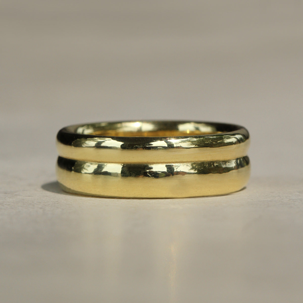 Our Duo Band celebrates the union of two lives becoming one. Sculpted with a comfort silhouette—smoothly rounded on the inside and outside—this double band offers both presence and ease for everyday wear. Measuring approximately 6.5mm wide, this band begins a meaningful stack, representing "the two of us."