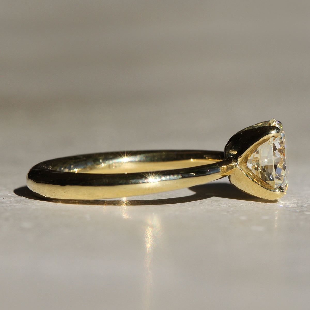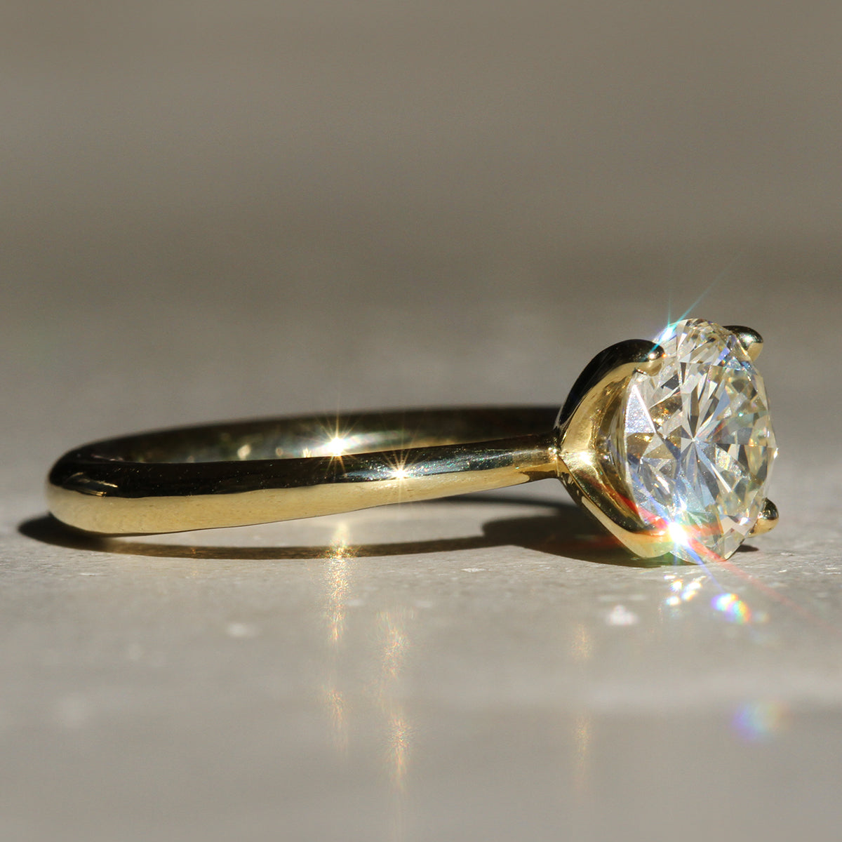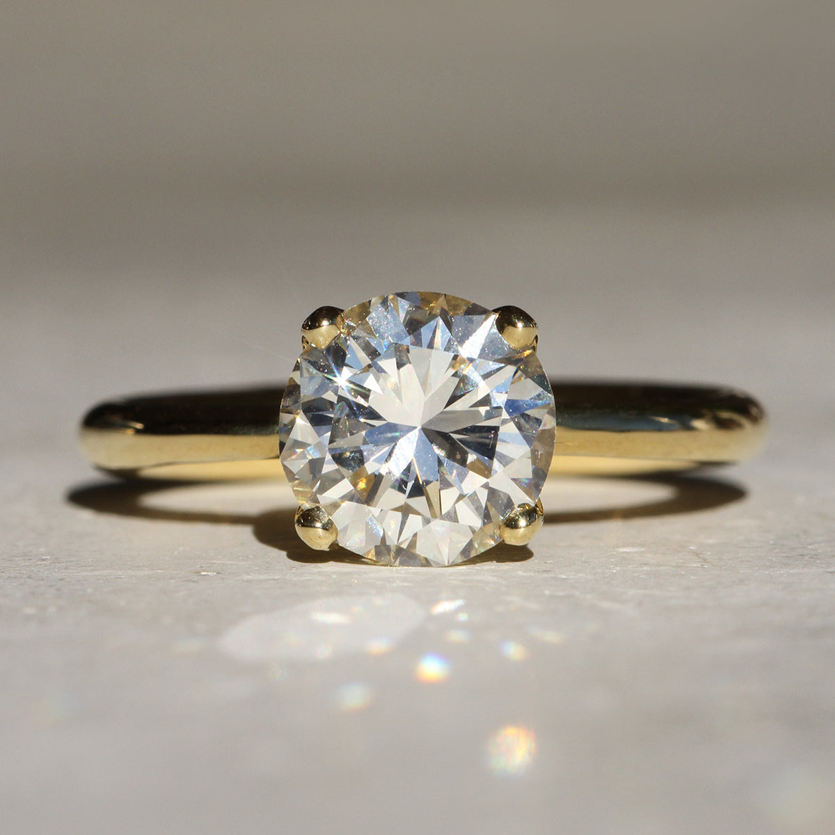 This timeless ring features a reclaimed 1.81ct Round Brilliant diamond. The stone has GIA certification and a grade of O-P/VS1.
