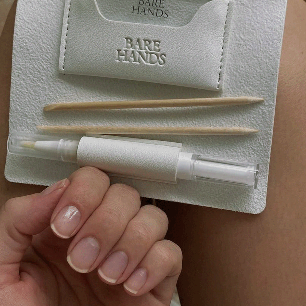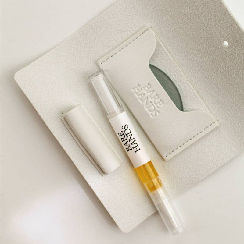 Reveal your healthiest natural nail. Packed in a vegan leather case, The Polisher and Cuticle Oil hydrate, condition cuticles, and add a natural shine—with only the purest ingredients. The Polisher’s glass and mineral blend gently bind keratin cells with no chipping and no dry time needed.