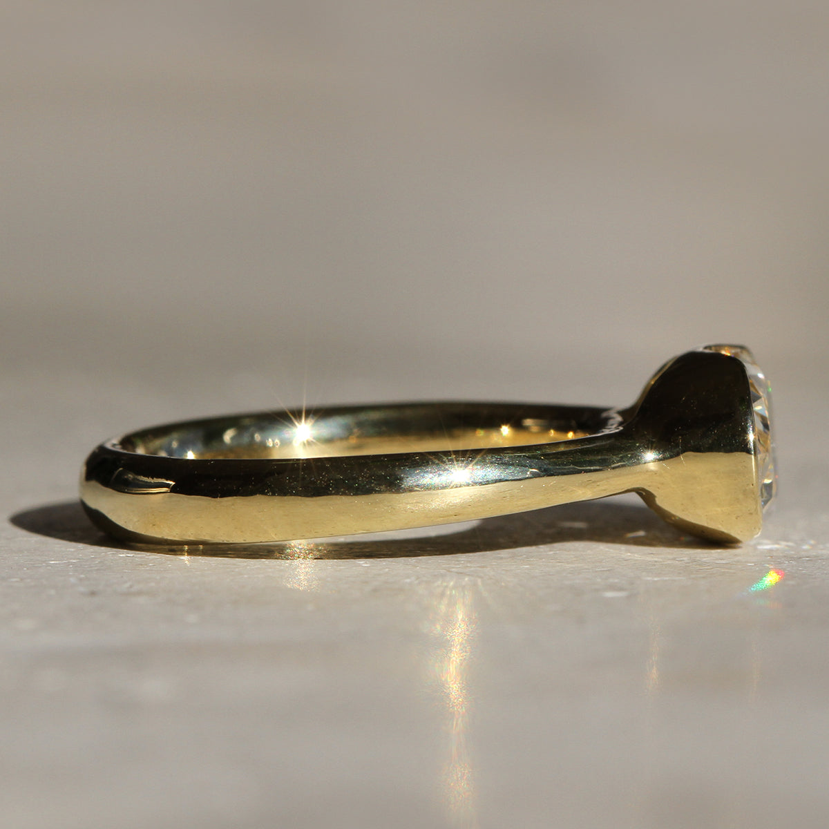 The soft curves of the Poppy Bezel cradle the stone in a unique setting that dips softly at either side—inviting abundant light into the diamond and creating a distinctive sculptural silhouette.