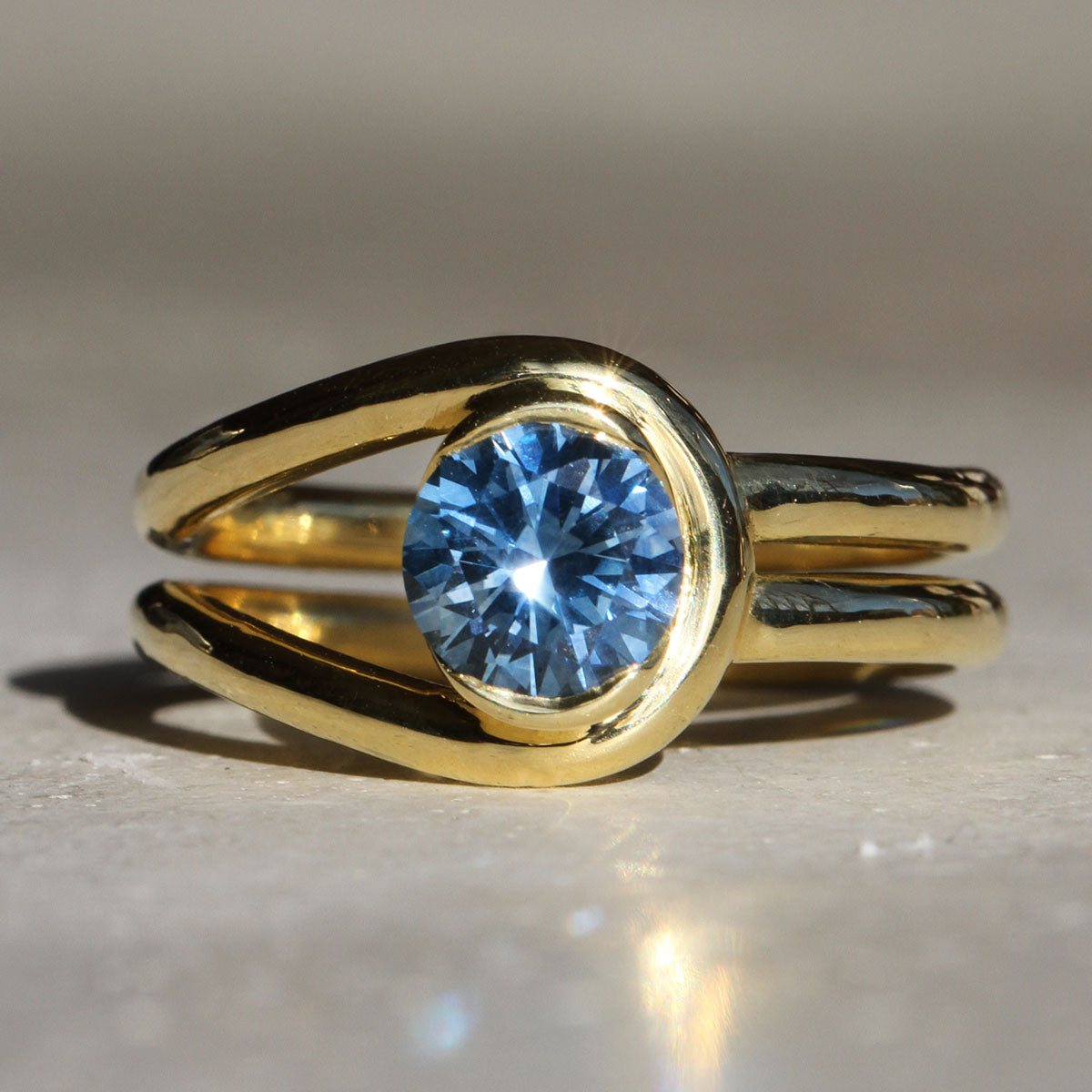 The Loop Solitaire is a bold statement ring, with a rounded band that loops dramatically around the solitaire diamond, before wrapping the finger. An exclusive design feature of Sophie Hughes’, the tapered Poppy Bezel dips to reveal the diamond on both sides - allowing more light into the diamond for maximum brilliance, while maintaining the sleek lines of a bezel.