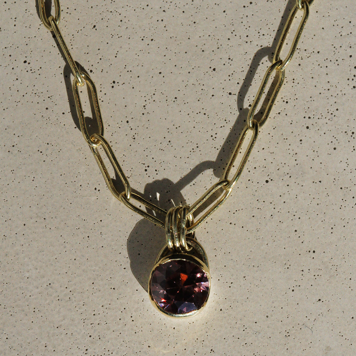 A dazzling natural Mauve Zircon (1.70ct) is set in a recycled 18k yellow gold Poppy Bezel.