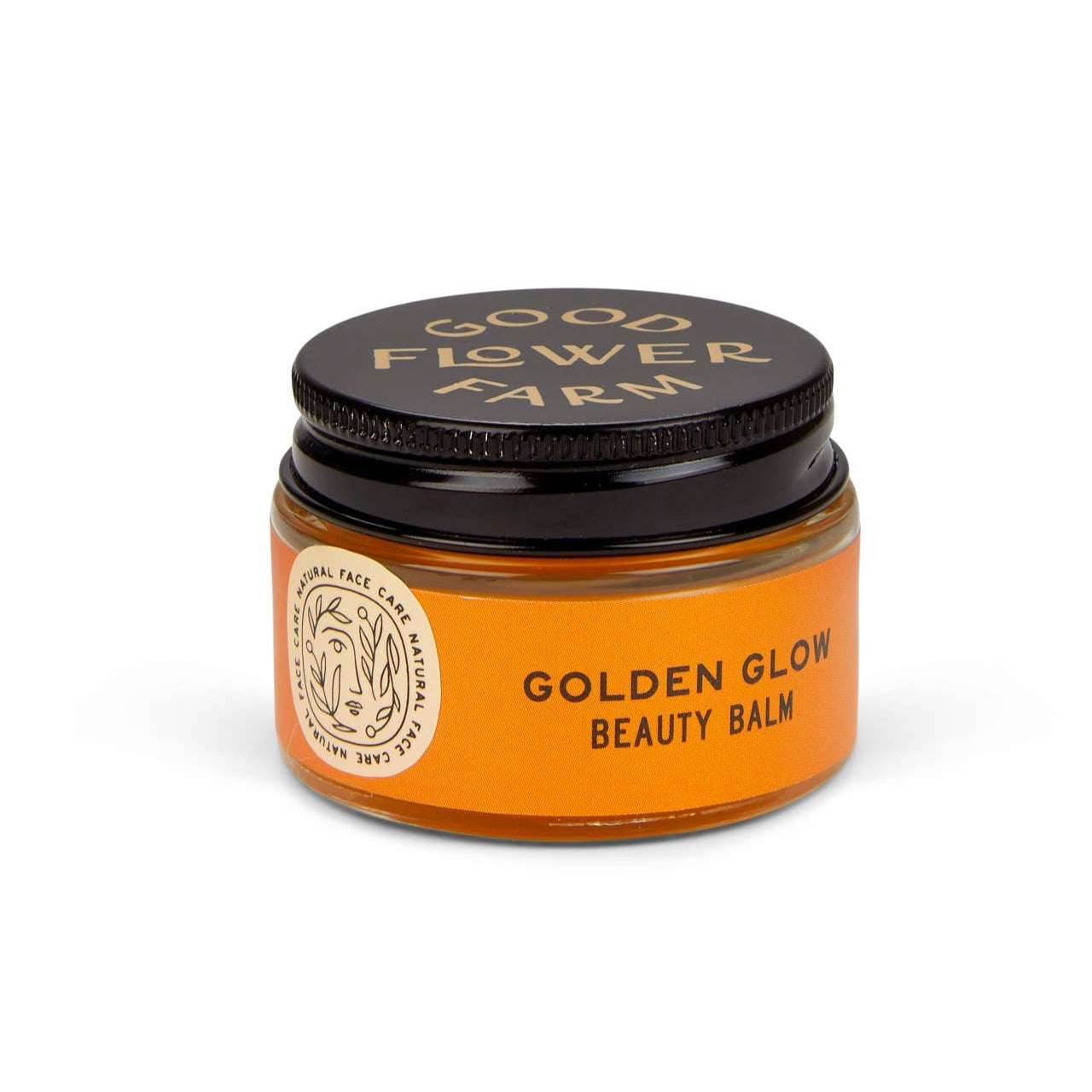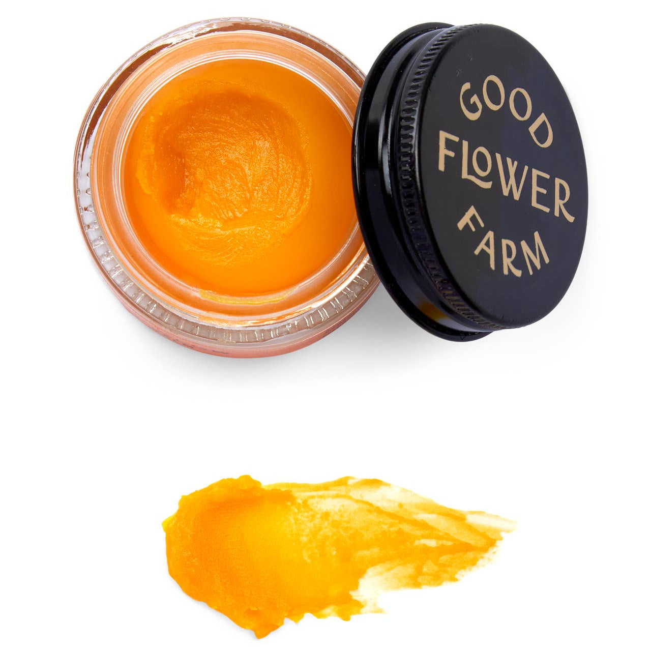A glass jar with a black metal lid labeled 'GOOD FLOWER FARM' containing a yellowish beauty balm, alongside a small amount of the balm placed outside the jar.